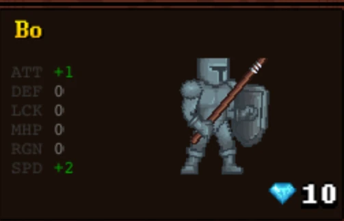 The bo sword costs 10 gems and gives the player an additional 1 point in attack and 2 in speed. Its sword swing is very fast, but it doesn't do a whole lot of damage. If using this sword is desired, having points in attack is recommended.