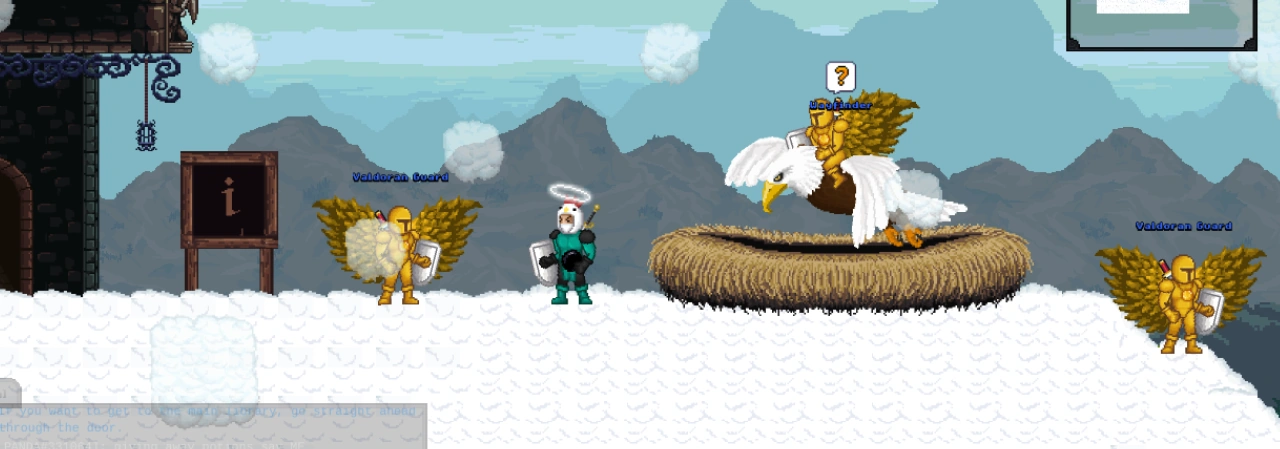 To travel to the library, jump up to the second level of the Valdoran Castle, to the left side, where you will find an eagle's nest on the balcony. A Wayfinder guard on a bird will offer you a ride to the library. You will arrive on a cloud at a different eagle's nest. Falling off of the cloud will send you back to the ground, into Valdoran city. You can talk to the Wayfinder guard again to get back to Valdoran. Go through the door to the left to enter the Lobby of Valdoran's Library.
