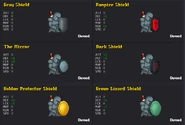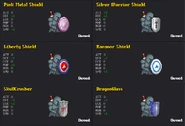 Shields can be bought in home page. They have the ability to block attacks (not all attacks and the damage received depends on the player's defense points) while the player holding 's' 'down arrow' or 'down' key. Shields can give players extra skill points similar to other cosmetic and weapons which can be useful for low level players. Shields are useful in PvP as players can use shields to block sword attacks and reduce tons of damage. There are also some techniques using shields against mobs such as the timing to attack after blocking.