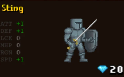 Sting is one of the best swords which costs 20 gems and gives you 1 point in attack, defense, and speed. It's very popular, about 70% of all players use this sword because of its fast swing and good damage. Added during Daragorn update. It's recommended for all levels of player to use.